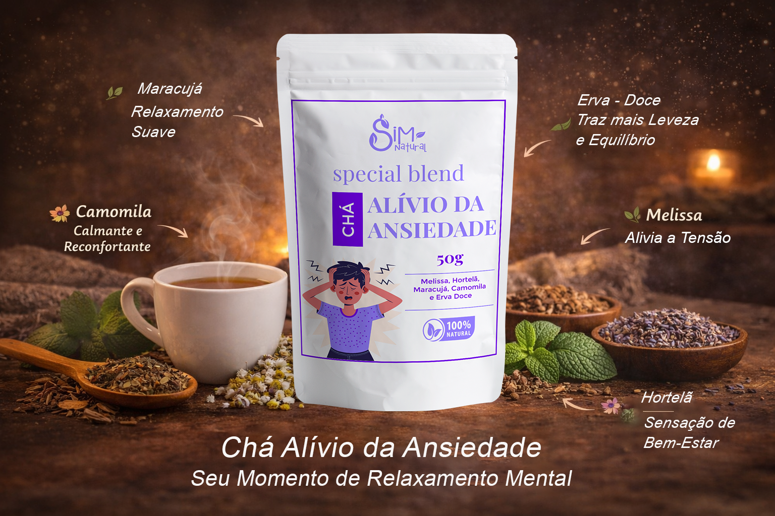 Acredite no potencial do natural. O Chá Alívio da Ansiedade foi desenvolvido para ser uma parte integrante da sua rotina, proporcionando momentos de pausa que você merece. Permita-se essa experiência de tranquilidade e reequilíbrio com cada xícara.