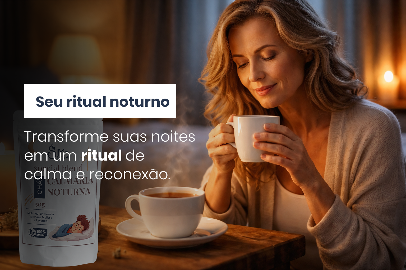 O Chá Calmaria Noturna foi desenvolvido para transformar seus minutos antes de dormir em um momento de pausa, equilíbrio e tranquilidade.