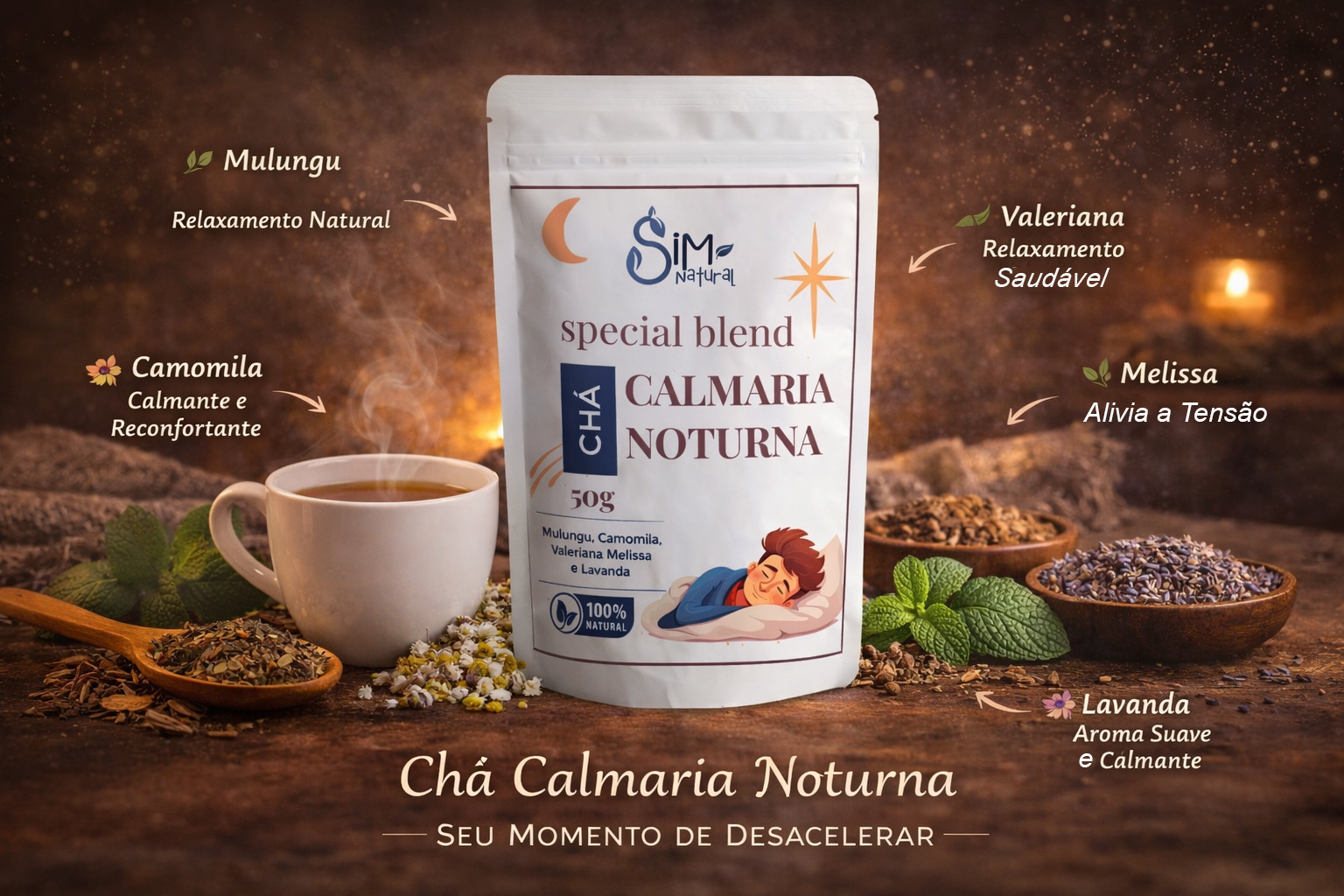 Desfrute de noites tranquilas com o Chá Calmaria Noturna Blend da Sim Natural. Esta combinação cuidadosamente elaborada de ervas é perfeita para quem quer ter uma noite mais tranquila, proporcionando um delicioso sabor que acalma a mente e o corpo.