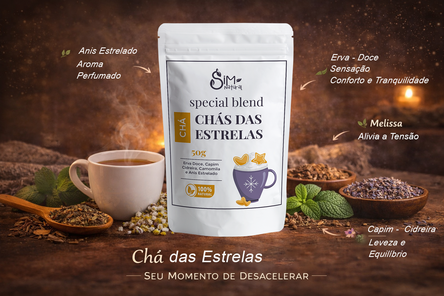 O Chá das Estrelas reúne ervas tradicionalmente utilizadas para promover relaxamento e bem-estar: